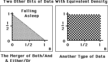 Notice that the same value would be thrown into the Data Box after the hour, but that they represent different phenomenon. Notice also that each Data Bit has two dimensions rather than one. This conception includes the ideas behind Fuzzy thinking as well as traditional Logic: a marriage rather than a divorce: Both-And & Either-Or. Finally be aware that the dimensions are flexible. The Data Number thrown into the box could be anything but the Data Density would always be 0.5, regardless of the limits.