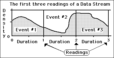Our Live Data has two dimensions, Duration and Density. The Density moving across the Duration is an Event. A precise beginning and end define the Duration. An Event is that which occurs between these limits. A Data Reading occurs at the beginning and end of each Duration. Each time a Reading is taken, a number quantifies an Event. This number tells what is as well as what isn't. (This concept becomes important, later on, in defining the Null Stream.)