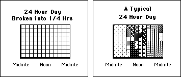 Note also the white ¼ hour squares that are unpatterned. These are undifferentiated Awake times. Although the individual is awake, the ¼ hour doesn't fit into any of the Awake boxes. It also doesn't fall into the Sleep box. Finally be aware that each of these quarter hour boxes can also be fuzzy. The experimenter has called each box a distinct name and given it a corresponding pattern, but in reality each quarter hour square has some elements of uncertainty associated with it unless of course, it is Dead Data. {See Live Data Sets Notebook for more Info.}