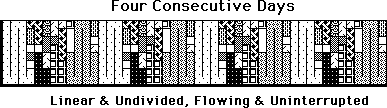 We start out with the undifferentiated 24 hour Day, flowing endlessly. We then set up the first polarity, Waking and Sleeping, White & Black. But then the Waking hours are further broken into myriad categories, the beginning of Color. So our Data Bit assumes much more complexity. Let the duration of our Data Bit be a Day, which we break into ½ hour segments. It would look like this.