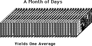 Then taking the Density a step further, we can say 2.5 hours of Writing per day per week. This one number can characterize the Writing for the designated week. If we had a series of numbers expressed in the same form which added up to 24 hours, then these numbers would completely characterize the entire week with nothing left over. In The Experiment, for reasons we will discuss in the Fuzzy Data Notebook, the Duration we chose was one month. Although' readings were taken daily, the readings were thrown into a monthly container and then averaged out. One number expresses the entire month's contents as an average daily amount.