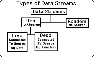 There are two main classifications of Data Streams, Real & Random. A Real Data Stream has a real world connection; hence there is a Source it was derived from. A Random Data Stream has no Real World connection, hence has no Source.