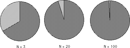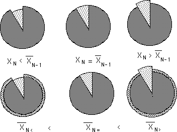 Traditional physical momentum has to do with the inertia of a physical system, the system's resistance to change. Data Stream Momentum has to do with the resistance its central tendencies to change. In order to understand this resistance to change, first, we will visually look at the potential impact of the Nth Data Point upon the traditional Mean Average. As seen from Equation 3 above the real impact of the Nth Data Point upon the Nth Average would be equal to its value divided by N. Its potential impact on the Nth Average would simply be 1 divided by N, the number of elements that make up the average. This is visually demonstrated below. The whole pie represents the Nth Average. The small wedge shaped piece represents the potential impact of the Nth piece of Data upon the Average. When N is 3, the first pie, the potential impact of the Nth Data is one third. When N is 20, the 2nd pie, the potential impact of the Nth Data is one twentieth. When N is 100, the 3rd pie, the potential impact of the Nth Data is one hundredth. It is easy to see that as N becomes larger and larger that the potential impact of the Nth piece of Data becomes smaller and smaller.