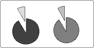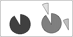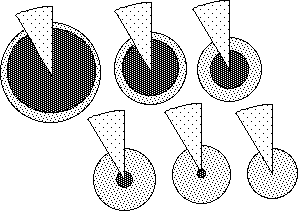 We've seen that the number of elements, N, and that the size of the new Data help determine the New Average. The final element is the Old Average. In the following diagrams the Data size is kept constant and the previous average is varied. The darkest interior area represents the Old Average. The wedge is the New Data. The Number of Bits, N, in the Data Stream, determines the angle of the piece of pie. The angle in radians = 2¹/N. The exterior circle around the outside represents the size of the New Average. The dotted donut on the perimeter represents the amount that would be added to the Old Average, the excess of the piece of pie.