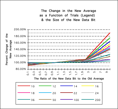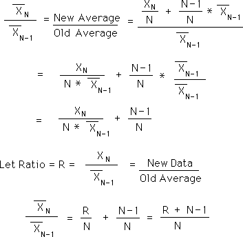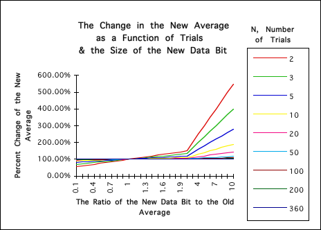 Following is a derivation of the ratio of the New Average to the Old Average. The above graphs are based upon this equation. It shows that the percent of change of the new Average to the Old Average is a function of R, the ratio between the New Data and the Old Average, and N, the number of trials.