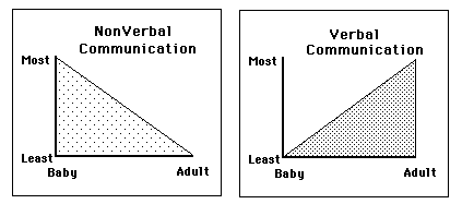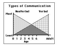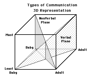 The point we're making is that verbal and nonverbal communications are not on one line or one plane together but instead are on two orthogonal or perpendicular planes. Each plane exists in its own right independent of the other, as is shown in the graphs above. So a degeneration to either all nonverbal communication or all verbal communication is a retreat from a dimension of communication with a resulting loss of information. Neither verbal nor nonverbal communication tells the whole story. When one loses the ability to communicate non-verbally, one loses a whole dimension of communication not just a degree. One relinquishes dimensionality.