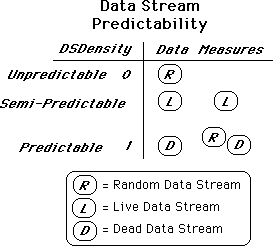 One way of distinguishing Data Streams is by their predictability. The chart below exhibits the differences. Live Data Streams and their measures are semi-predictable because their Data Stream Density is between zero and one. Dead Data Streams are totally predictable because there Data Stream Density is one. Random Data Streams are totally unpredictable because their Data Stream Density is zero. Random Average Streams are very predictable because their Data Stream Density approaches one. We will discuss this anomaly in the following paragraphs.