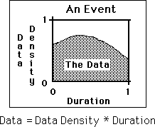 In order to reinforce distinctions, we will return to a brief reprise on data accumulation. Random Data has one dimension. It is only a number, unrelated to a Source. Random Averages have variable Durations that the averages are accumulated over. When the Duration is one, then it is the Random Data Stream. Real Data, Live or Dead, has two dimensions. Many people consider Data in any form, just a number. However, as was pointed out in the first part, time related data has two elements. First there is a Duration, the basic unit of data accumulation. Second there is the Data Density, the percent that the Source participated in the Activity during the Duration. The Data is simply the product of the Data Density, or % of Participation in the Activity, and the Duration. The Data quantifies the Event associated with the Duration. Below is a geometric representation of an Event with its two parameters. The vertical axis represents the Data Density. The horizontal axis is the Duration. The shaded area is the Data, the number that would be thrown into the Data box for that Duration.