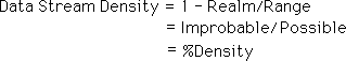 Data Stream Density refers to three dimensions because Time has been added. Time is included in the Deviations of the Realm. A more appropriate name for Data Stream Density would be Percent Improbability because it is merely a ratio of Improbable to Possible. For clarity, however, we will refer to it as Percent Data Stream Density, %Density, in the following definitional Derivation, even though the density is what is not a percent of the whole rather than what is.