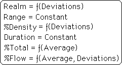 Below is a breakdown of the variables and constants making up the Percent Data Flow. We see that the Range of Possibility and the Duration are constants. The Realm is a function of Deviations while the % of the total is a function of the Average. Hence the percentage of the flow is a function of Averages and Deviations. Of course, these are functions of the data.