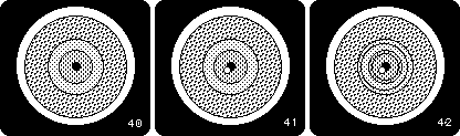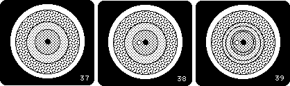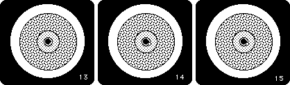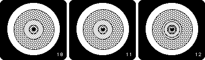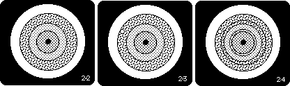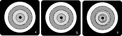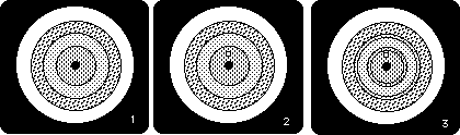 In frame 1, we have a typical moment in time. The dot in the center is the Decaying Average. The area surrounding the dot is the Greater Realm of Probability. A circle with a radius of one Average Deviation bounds it. The second area, a donut or ring, is the Lesser Realm of Probability. A circle with a radius of two Average Deviations encircles it. The third area, a larger donut, is the Greater Range of Possibility or the Ring of Potential. The Edge of Actuality encircles it. The fourth area, colored white, is the Lesser Range of Possibility or the Ring of Imagination. The limits of Imagination determine the boundary. The outside area, colored black, is the Range of Impossibility. A new Data Bit Falls within the circle of the Greater Realm, frame 2. The Realm shrinks, both inner circles shrink, frame 3.