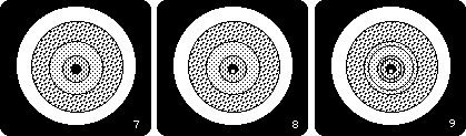 In frame 7, the Ring of Potential grows while the Realm continues to shrink. Again a new Data Bit Falls within the circle of the Greater Realm, frame 8, this time within the Decaying Average, Bull's Eye. Again the Realm shrinks, frame 9.