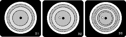 After adjustments, frame 31, the Ring of Potential is still quite small while the Realm of Predictability is larger still. The organism retrenches with a Data Point in the now large Greater Realm, frame 32. While predictable and a bit boring compared to what this human has just been through, it does shrink his Realm and expands his Ring of Potential, frame 33.