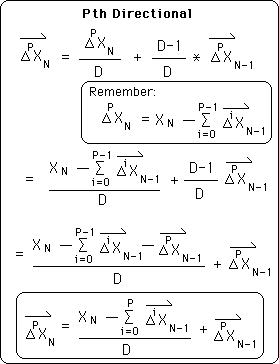 Verbally this equation says that the Pth Directional equals the difference between the Present Data Stream and the sum of all the past Directionals of all levels including the origin divided by the decay factor, D, added to the prior directional of the same level as the one sought after. An intriguing and beautiful equation.