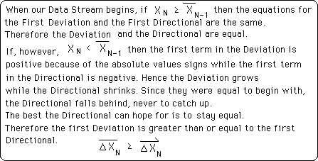 Remember that Directionals have no meaning in a static Data set. This is the scientists of static Data Sets never discovered them. The only time Directionals have meaning is when they are applied to growing Data Streams. Deviations have their parallel in the Average Deviations or Standard Deviations of Static Data Sets. Also the Decaying Average has its parallel in the Mean Average of the Data Sets. Hence Directionals are the only tool we have developed that is truly unique to our system. Directionals only have a meaning in a dynamical system based upon Data Streams rather than Data Sets.