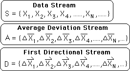Before plowing ahead let us make a firm differentiation between Streams and Series, in the context of our discussion. Below are three Streams. The first, S, is a raw Data Stream. The Data is numbered, ordered. The Stream has no end. There is a specific interval between each piece of Data. The second stream, A, is derived from the first stream. It is the Average Deviation Stream, the stream of average changes or the first level of Deviation. It is ordered, without end, and totally dependent upon the Data Stream for its life. The third stream, D, is also derived from the first stream. It is the First Directional Stream, the stream of first Directionals. It is ordered, without end, and also totally dependent upon the Data Stream for its life.
