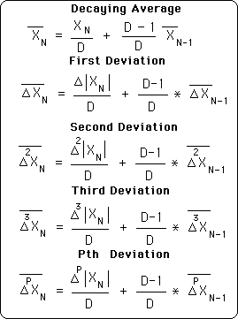 Let us review some of our definitions to cement their meaning for the Notebooks that follow. The Decaying Average formula below determines an average, which is sensitive and relevant to the Data Stream. {See Decaying Averages Notebook.} Because of the need to know the boundaries of the Realm of Probability, the First Deviation was calculated by the second formula below. This is the Decaying Average formula applied to the First Scalar. It calculates the average change. Similarly we can apply the same Decaying Average formula to the Second Scalar, which is the Change of Changes. This is represented in the third formula below, the Second Deviation. We can extend this process indefinitely, finding the third, fourth, and Pth Deviations. Below are the Third Deviation and the Pth Deviation.
