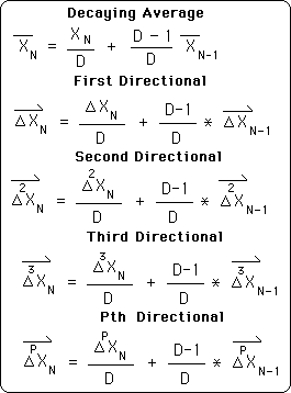 The Decaying Average is the root of the Directional Series as well as the Deviational Series. Hence it is included here to begin our Directional Series. It is related to the average position of our Data Stream. Notice that the arrow of the Directionals has replaced the bar of the Deviations, but that equations are parallel.