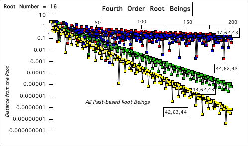Lest there be any diehards who might think that some of the Past-based Root Beings still approaches the Root at 40, let us see what happens when the Root Number is 100. At this level, it is unmistakable that even the Best-of-the-Past is approaching no limit, but is instead bouncing around relatively aimlessly.